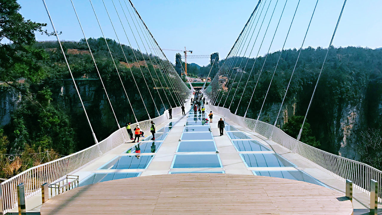 Walk along the Zhangjiajie Grand Canyon Glass Bridge. This bridge is not only the highest, but also the longest glass bridge in the world. It is not for the faint-hearted (the Glass bridge is built between two mountains of Zhangjiajie Grand Canyon, it is 375 meters long and 6 meters wide, with a height of 300 meters from bottoms).